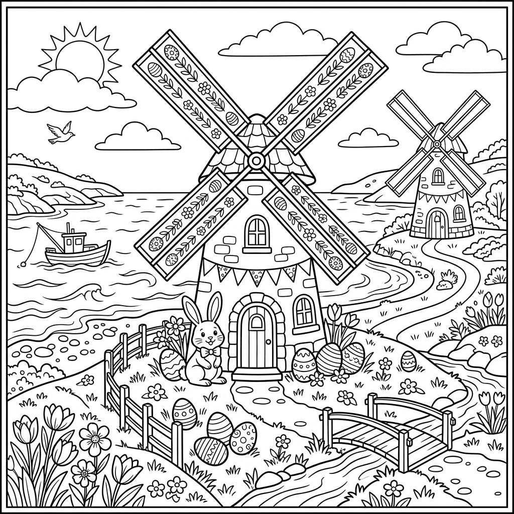Celebrate Easter with this delightful coloring page featuring charming windmills along a vibrant coastline. Adorned with festive bunnies, decorated eggs, and blooming flowers, it's a perfect scene for creative relaxation.