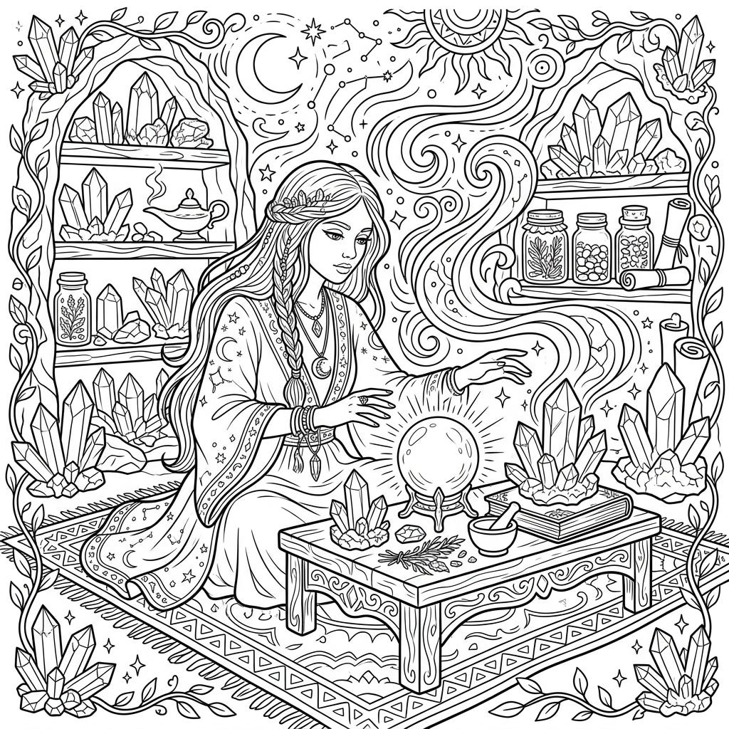 View coloring pageThis enchanting coloring page invites you into the mystical world of a Crystal Witch, surrounded by potent gemstones and ancient spells. Perfect for those who love magic and intricate designs, it offers a captivating escape to unleash your creativity.